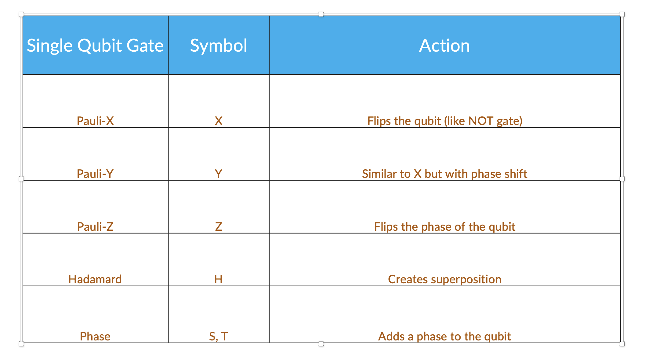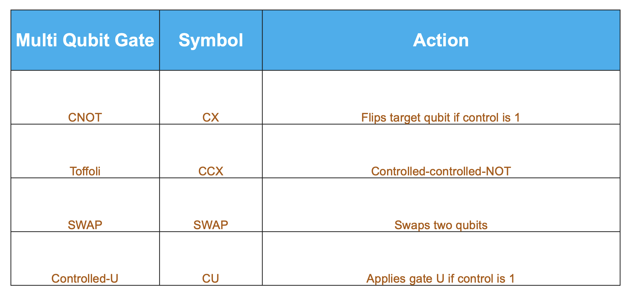 Quantum gates and circuits: A quantum gate is a fundamental operation that transforms the state of one or more qubits. The Classical logic gates operate on bits (0 or 1), whereas the quantum gates operate on qubits that can be in superpositions of 0 and 1, and can also be entangled state. The Quantum gates are also called as quantum logic gates or unitary operators. The Quantum gates are single-qubit gates or multi-qubit gates. They are reversible and preserve the total probability. Some of the common single or multi qubit gates are as below:-